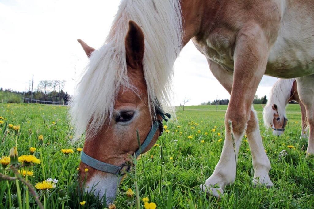- Zorg altijd voor voldoende ruwvoer (hooi/stro/luzerne/gras…), het liefst gedurende de ganse dag (weide is ideaal). Gebruik eventueel een slow feeder zodat uw paard langer doet over zijn porties ruwvoer en meer speeksel produceert.
