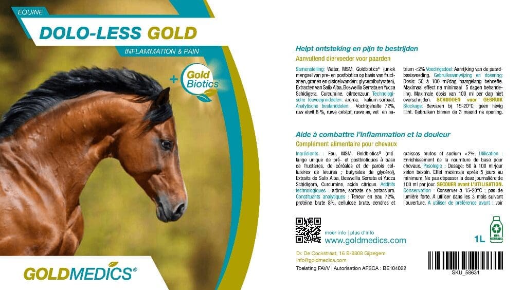 Wat Dolo-Less Gold bijzonder maakt, is de toevoeging van Goldbiotics®: een innovatieve mix van pre- en postbiotica die de darmflora van je paard ondersteunt. Een gezonde spijsvertering draagt bij aan het verminderen van ontstekingen en bevordert het algehele welzijn.